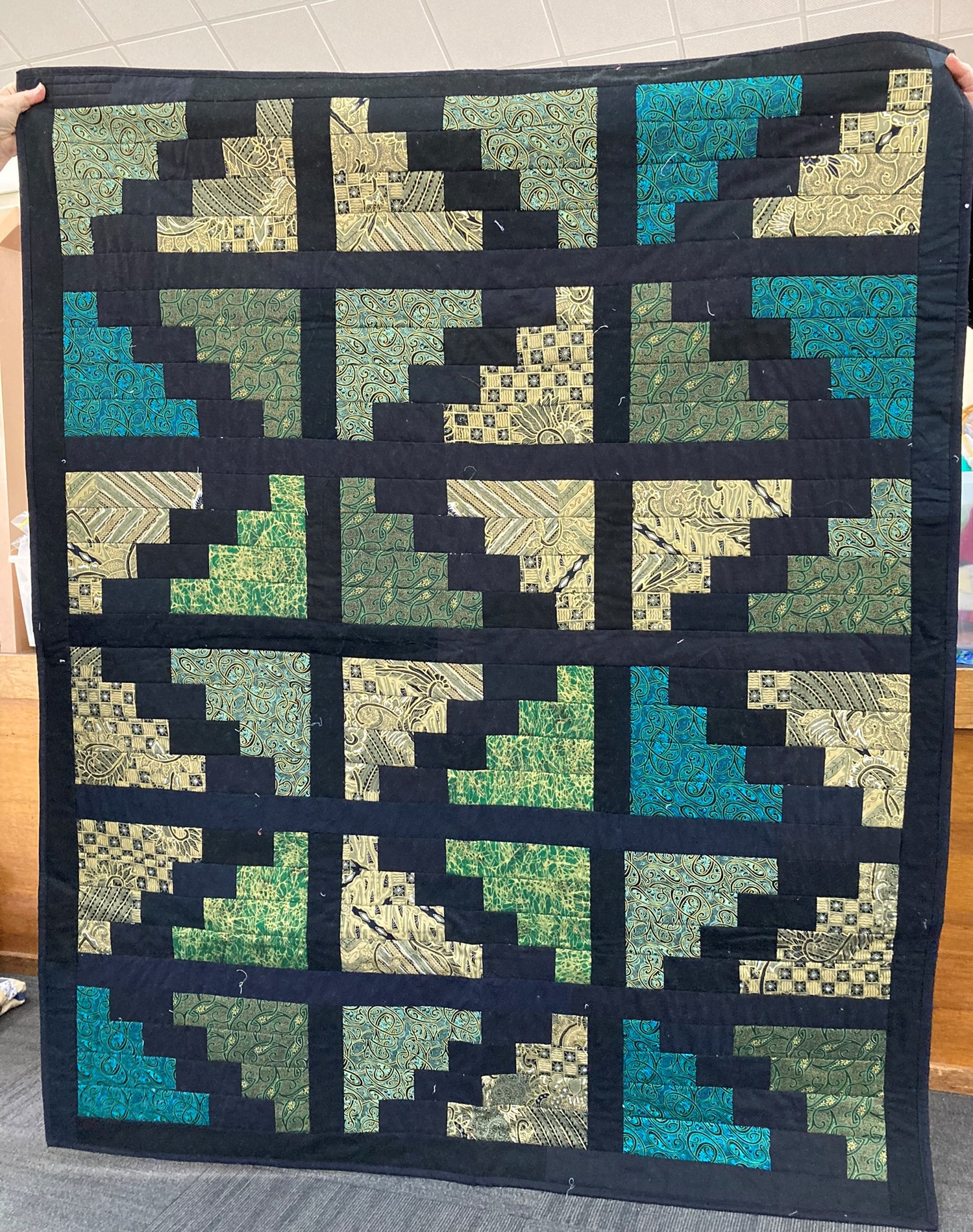 Barbara (who was the instructor on the day) showed a colorful, geometric themed quilt that had been assembled using both the row and block approach.